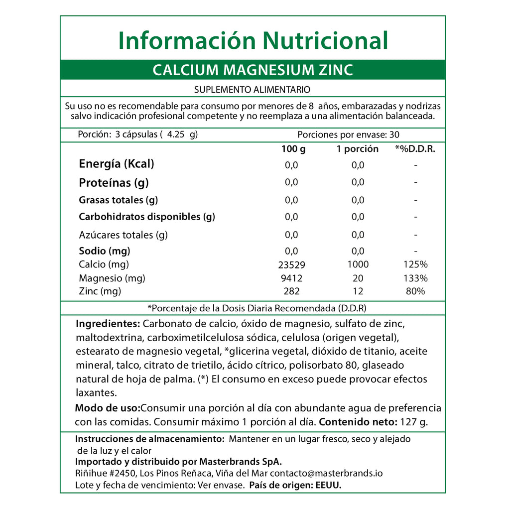 - 1000 mg Calcio, 400 mg MagneSio, 12 mg Zinc por porción