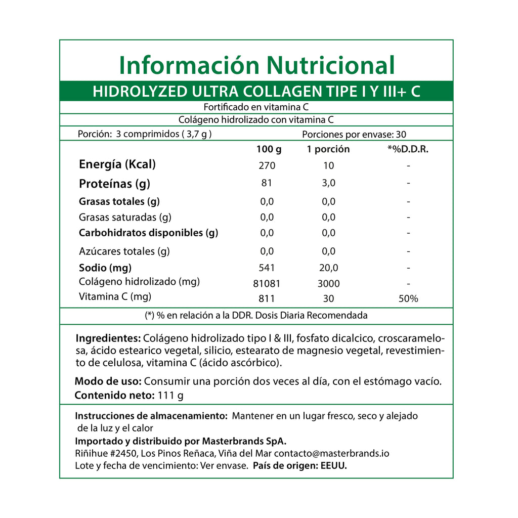 Colágeno hidrolizado tipo I & III, fosfato dicalcico, croscaramelosa, ácido estearico vegetal, Silicio, estearato de magneSio vegetal, revestimiento de celulosa, vitamina C (ácido ascórbico).