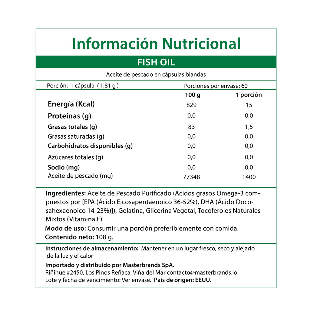 Aceite de Pescado Purificado (Ácidos grasos Omega-3 compuestos por [EPA (Ácido Eicosapentaenoico 36-52%), DHA (Ácido Docosahexaenoico 14-23%)]), Gelatina, Glicerina Vegetal, Tocoferoles Naturales Mixtos (Vitamina E).