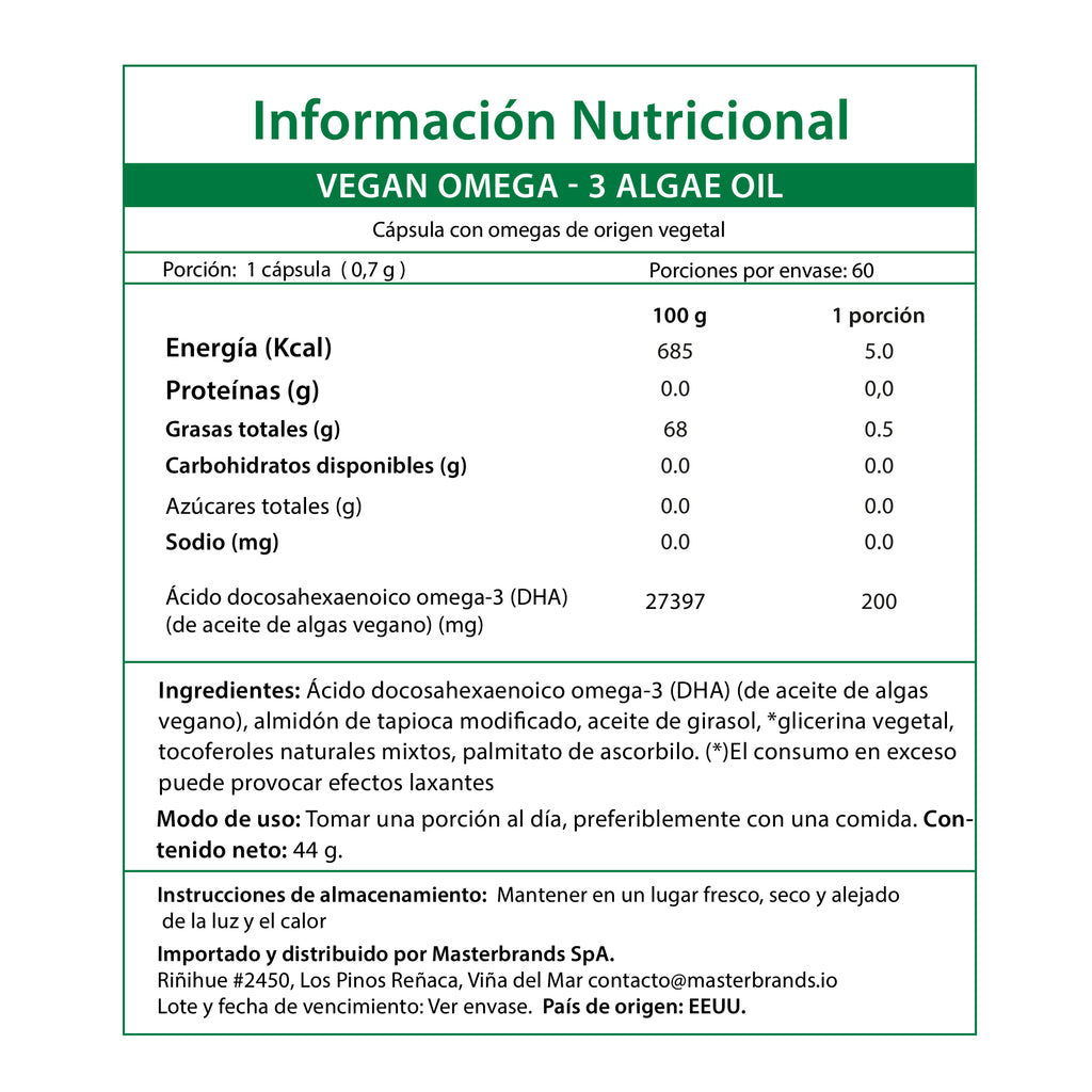 Ácido docosahexaenoico omega-3 (DHA) (de aceite de algas vegano), almidón de tapioca modificado, aceite de girasol, *glicerina vegetal, tocoferoles naturales mixtos, palmitato de ascorbilo.