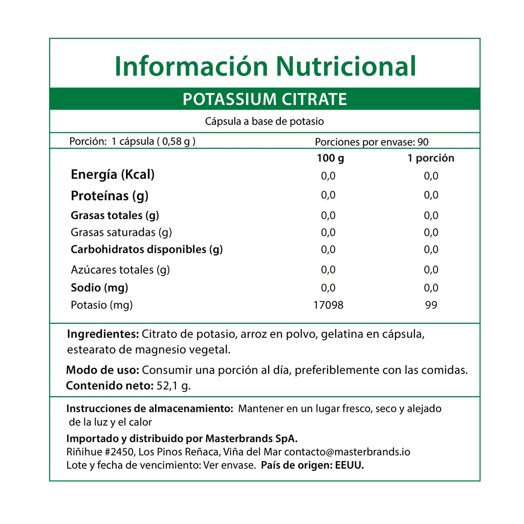 Citrato de potaSio, arroz en polvo, gelatina en cápsula, estearato de magneSio vegetal.